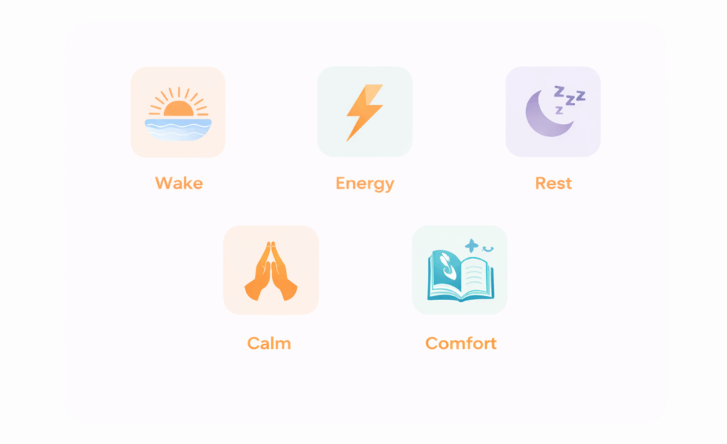 Programming for key moments like wake, energy, rest, and calming transitions – easy to use during or between visits.