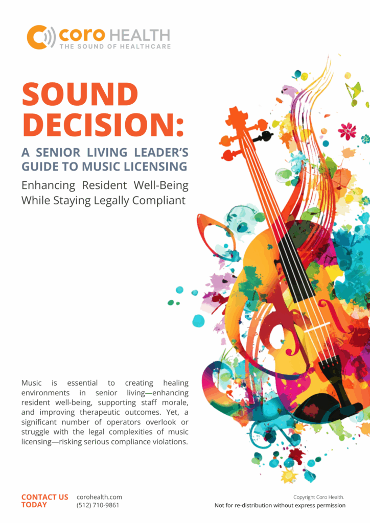 Learn how Coro Health minimizes the threat of fines and lawsuits while ensuring your residents enjoy beautiful, fully-licensed music.